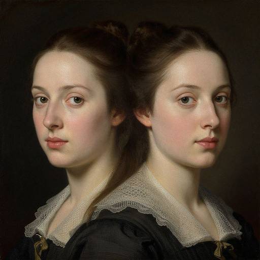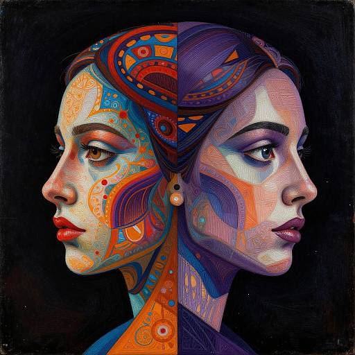 A painting of a twin shadowed faces with ebony black eyes, representing duality of light and darkness, double exposure effect, in the style of Andrei Riabovitchev, auto-destructive art, intricate oil painting, an oil on canvas
