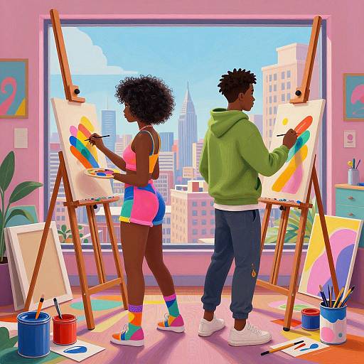 Painting of two men. Left man, bearded, dark hair, beige jacket, paintbrush in hand, intense expression, painting vibrant abstract background. Right man, partial view, striped shirt, watching, neutral expression. Rich red, gold, and brown colors dominate background.