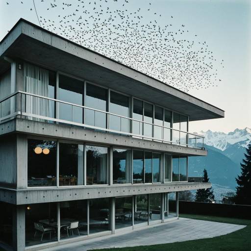 Perspective of a two story mid century style residential home inspired by Charles Eames. The exterior comprises brick, wood, and metal. Windows are positioned on the corners of the building. Lanterns adorn the underside of the roof. Set on the edge of the Appalachian Mountains. The scene features golden sunset light and wispy clouds with a tranquil ambiance.