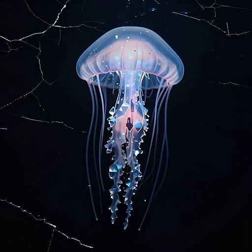 A magical crystal ball containing a translucent jellyfish named Celeste, surrounded by a deep ocean cavern and bioluminescent plants, hyperrealistic, surreal, ultra-detailed, cinematic, and dynamic composition