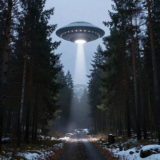 UFO Norway sighting over snowy fjords at dusk, glowing metallic disc hovering above pine trees, aurora borealis lighting up the night sky, mysterious and surreal atmosphere