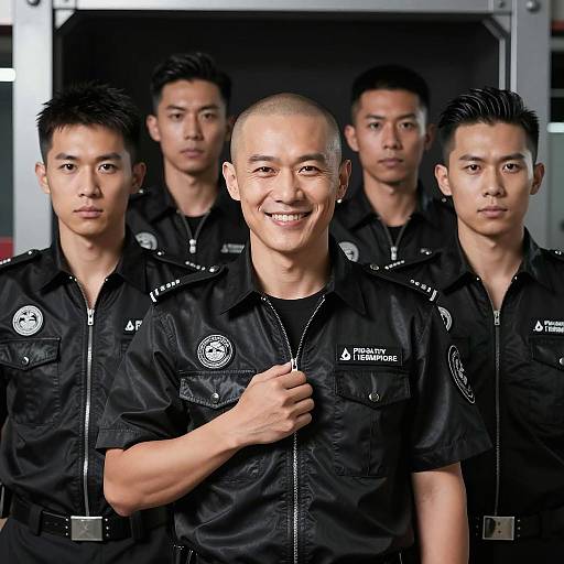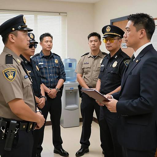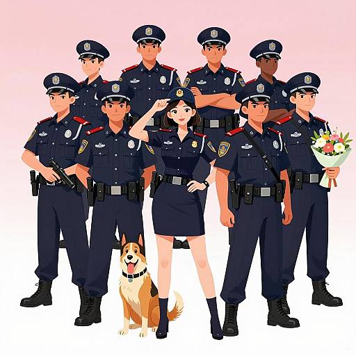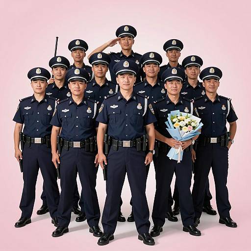 six men in police uniforms, arranged in vertical columns. Each man has a distinct facial expression: smiling, serious, mustached, intense, concerned, focused. Uniforms include police hats, shirts, and jackets. Background colors are blue and neutral. Hats have police emblems. Close-up, head-and-shoulders view. Men have varied hair styles and colors. Two men in the middle have mustaches. Bottom two men have brown hair.