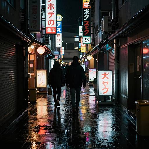 Tokyo night scene futuristic cyberpunk alleyway drenched in rain, neon signs in kanji flickering, steam rising from vents, shadowy figures walking under umbrellas, vibrant and moody atmosphere