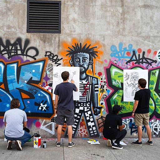 artistic teen, short dyed hair, slim build, denim vest, graphic tee, cargo shorts image in the style of Urban Graffiti Aesthetic, vibrant urban mural studio background