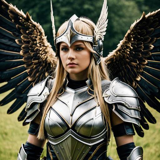 Valkyrie leading a group of warriors, cinematic atmosphere and dramatic composition.