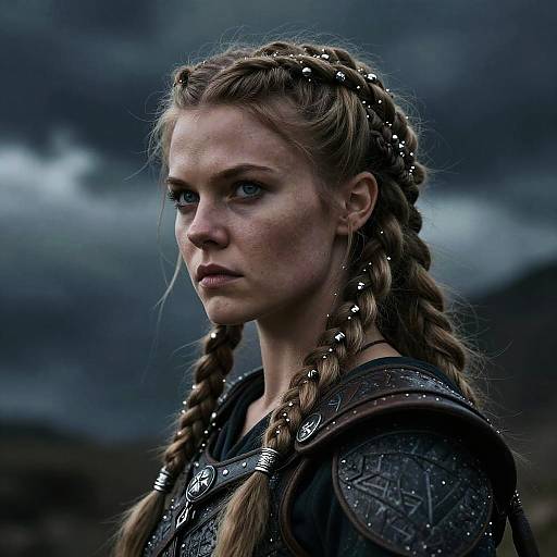 female Viking shieldmaiden alien creature portrait with a cool-toned effect and fierce warrior atmosphere. The creature has pale skin, braided hair with beads, determined look, depicted with high detail to evoke a demigod quality.