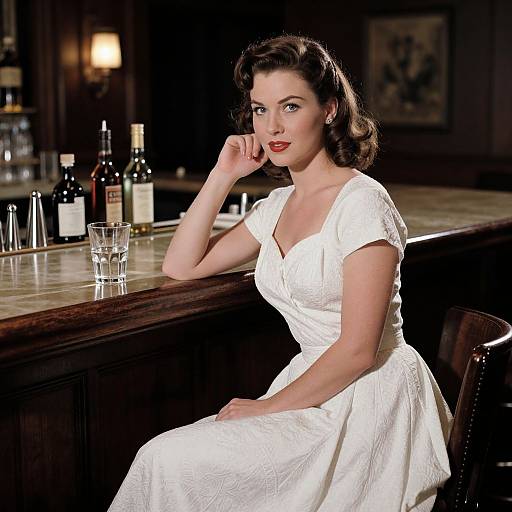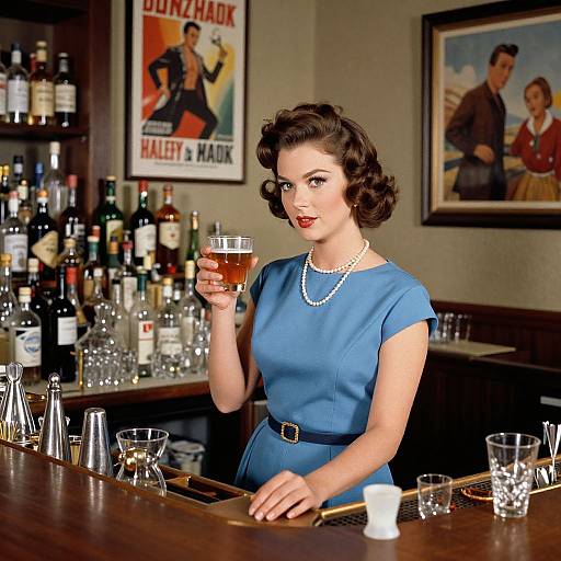 A high-resolution digital mid-century modern poster portrait set in a slick 1960s cocktail lounge, featuring a cocktail waitress with retro bob and bold eyeliner. Wardrobe leans retro—halter silhouette dress with pearl earrings. Confident head tilt, playful smile or smoldering gaze, polished posture. Cohesive props and scene details (martini glass, chrome bar stools) enrich the narrative. Dramatic key with soft rim light, saturated complementary palette, subtle halftone or film grain texture, crisp edges, sharp focus, 8k detail, vintage glamour reimagined with contemporary finesse.