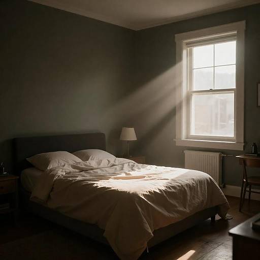 a young woman with long wavy brown hair wearing a light yellow lace dress with buttons and a black belt, standing indoors near a wall with strong warm sunlight casting dramatic shadows and a window pattern, soft golden natural light highlighting her face and dress, vintage warm ambiance, moody and calm atmosphere