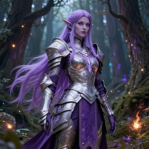 A elven warrior with sleek features possessing flowing silver hair and captivating emerald eyes. Dressed in an exquisite decorated leather armor, she stands in a magical enchanted forest, embodying the essence of a fantasy tale.