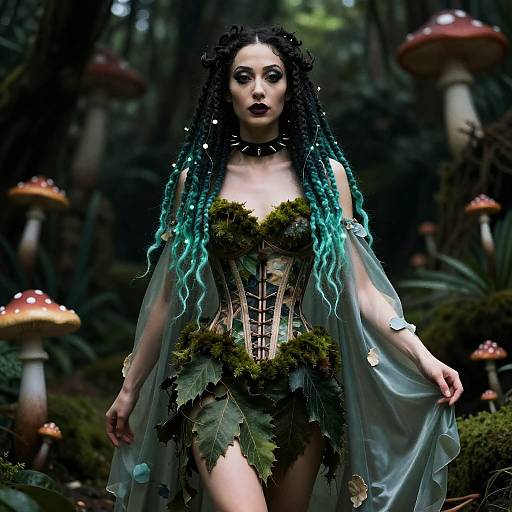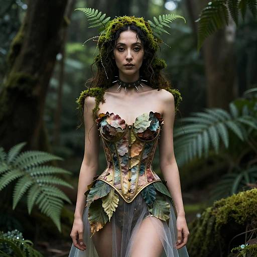 A young woman stands gracefully on water lilies in a serene forest pond, wearing a flowing dress adorned with vibrant floral patterns. The peaceful natural setting and soft lighting create a dreamy, ethereal atmosphere that highlights her calm and reflective expression.