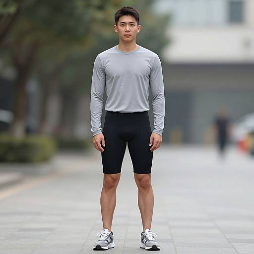 outfit basketball shorts, photograph of a young muscular man with short brown hair, wearing a dark navy t-shirt with white trim on the sleeves, and gray athletic shorts with a black drawstring, standing against a ured gray wall, casual, daytime, natural light, confident expression, wristwatch on left wrist, no other objects or people, slightly shadowed background, realistic style, modern athletic fashion, standing upright, medium shot, neutral colors, urban setting