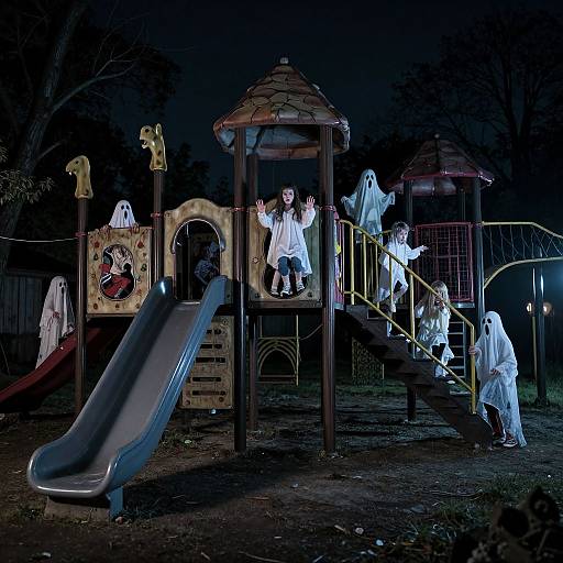 A surreal scene of a haunted playground for ghosts at midnight, mist swirling, glowing ethereal swings and slides, ghostly figures playing under a full moon, eerie yet whimsical atmosphere