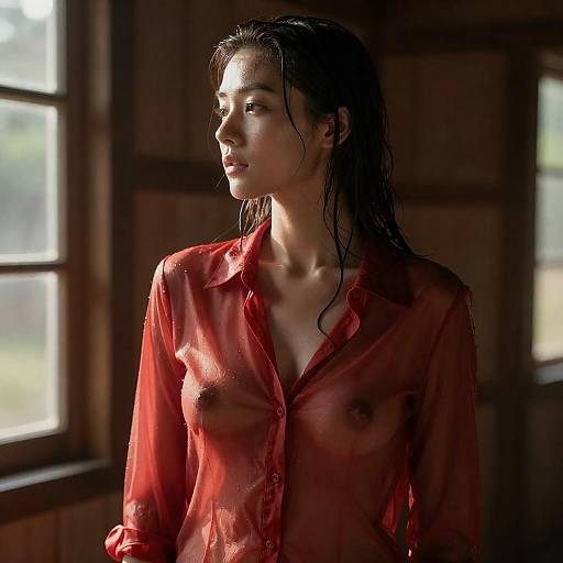 Photograph of a woman with wet, dark brown hair, standing shirtless, gazing intently at a small, illuminated window in a beige wall. She holds the frame with both hands, right profile visible. Background: pale green tiled wall.