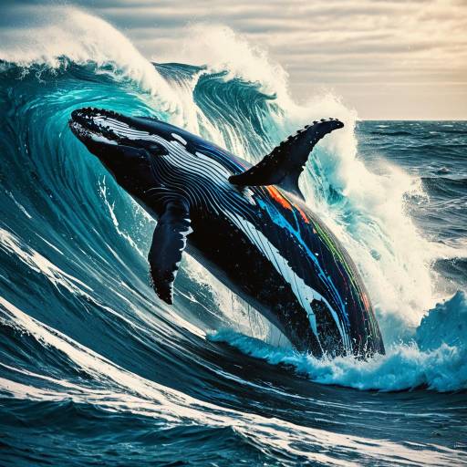 A majestic whale with a body crafted from wrinkled and faded paper pieces, styled as intricate origami art. The artwork blends surrealism and installation art, showcasing delicate textures and a high level of detail. Rendered as a poster, the piece has a refined, masterwork quality that emphasizes the fragile, textured layers of the paper. The composition captures a balance of strength and delicacy, creating a surreal and captivating visual experience.