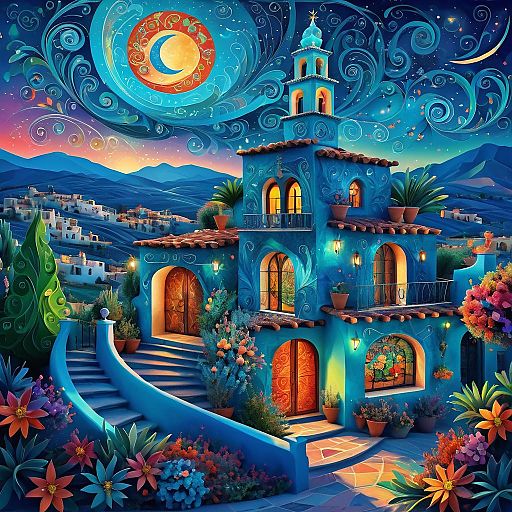 a whimsical castle, inspired by Eric Carle and Van Gogh, featuring a sparkling moat in the distance and a shimmering sunset refracting light. The painting combines fairy tale aesthetics and vibrant children's book color palettes, creating a magical, enchanting universe with cosmic wonder.