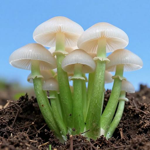 A captivating image of a cluster of colorful mushrooms, illuminated in enchanting macro photography style inspired by David Hockney. Set in a temperate forest at blue hour, backlit with tiny LED lights, low angle shot with Canon R6 and Canon EF 100mm f/2.8L macro lens, focus stacking for depth, creamy bokeh background. Post-processing removes visible light sources, leaving only ethereal glow.