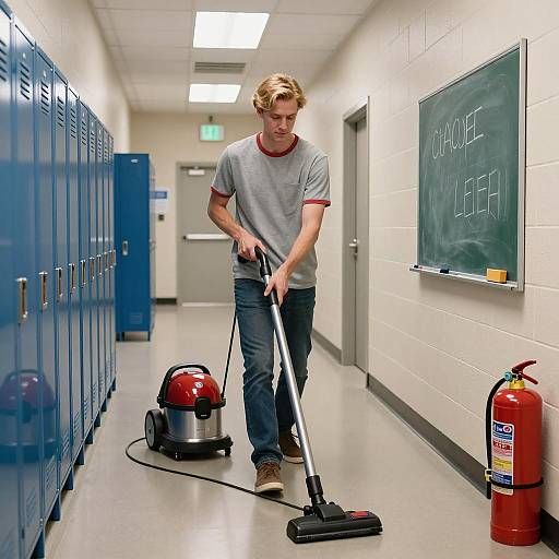 Photograph of ten schoolgirls in black uniforms, lying face down in a long, narrow hallway with metal lockers on the left. They are in a row, arms outstretched, legs straight, and feet pointing forward. One girl's hand is visible in the front. The hallway has white tiled floors, and a person walks away in the background. A brown bag and red fire extinguisher are on the right.