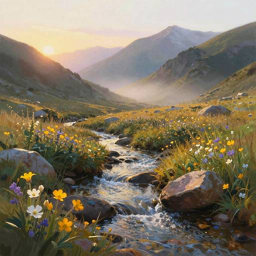 a misty valley at sunrise, featuring rolling hills blanketed with morning fog and wildflowers, painted in romanticism oil painting, with gentle golden glow, high quality and vibrant