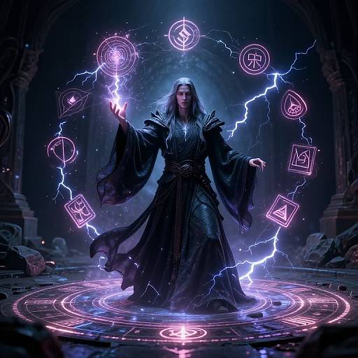A male wizard conjuring swirling storms of lightning, his majestic cloak woven with silver threads, standing in a desolate mountain peak, surrounded by crackling energy arcs and ancient runes, intense and electrifying