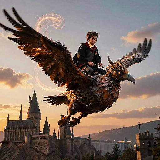 Harry Potter riding hippogriff over a moonlit lake, reflecting shimmering stars, ethereal glow, detailed Hogwarts castle in background, cinematic wide shot, high fantasy style