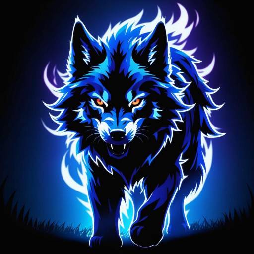 A stunning digital painting of a fierce wolf with striking blue eyes in a natural fur coat, with dramatic moonlight and a backdrop of a dense, misty forest.