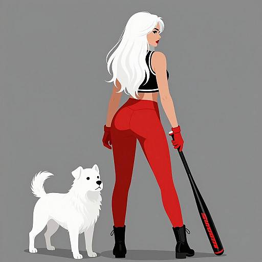 woman with silver lavender long curls, revealing athletic build, with smoky eyeshadow and matte red lips, wearing off-the-shoulder knit sweater, walking with a miniature schnauzer