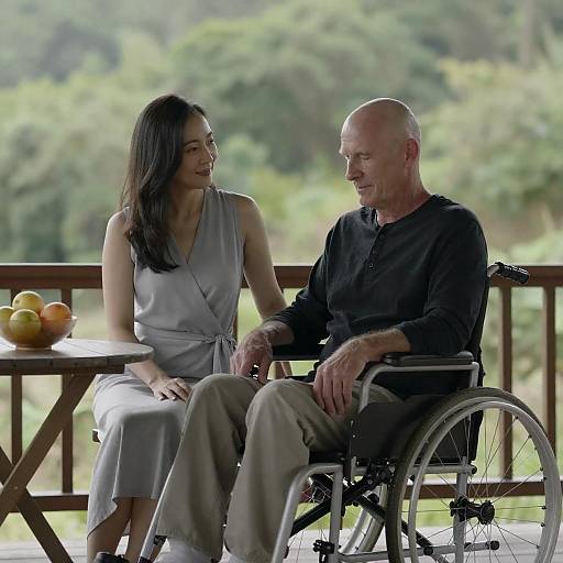 Photograph of a woman with red hair in a white dress, seated in a wheelchair, casting sharp shadows on a dark, industrial-style wall. A silhouetted person stands to her left, partially obscured by shadows and metal structures.