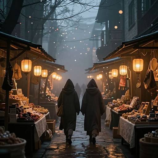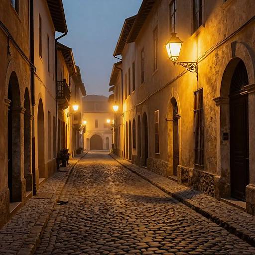 A whimsical alleyway winds through a fantastical cityscape where colossal, sentient mushrooms with spattered caps tower over cobblestone paths, their otherworldly presence blurring the line between nature and architecture.