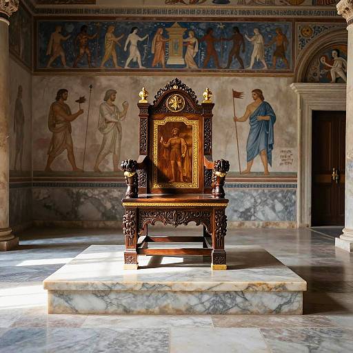 Ancient Roman throne crafted from polished wood and gold leaf, decorated with symbols of power and authority, set inside an opulent villa room with mosaic floors and frescoed walls.