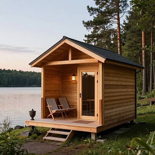 Illustration of a simple house made from wooden planks, by a lakeside. Matte transparent texture, black background, movie lights, rich detail, highest quality, minimalist with smooth and sleek shape, luxurious and elegant.