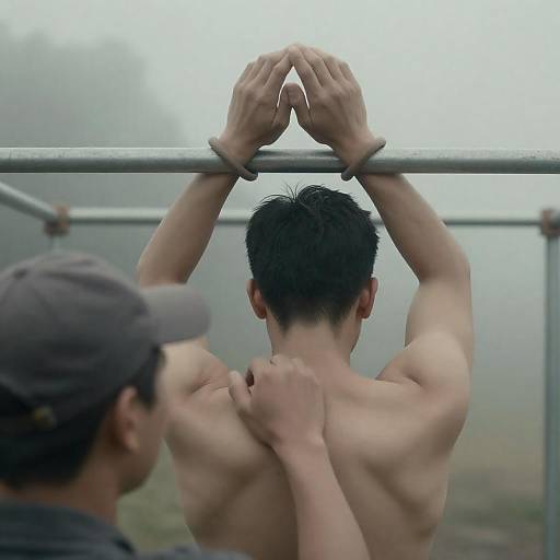 full body, 1girl, solo, young girl with long green hair tied in a top bun, sitting, arms up, hands restrained, chains, cuffs, handcuffs, collared shirt, white shirt, shirt tucked in, long sleeves, black necktie, black pants, barefoot, parted lips, butterfly_sitting, grey background