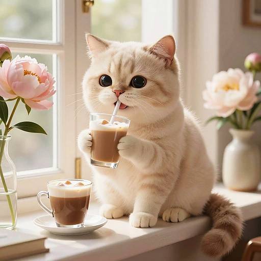 a playful kitten enjoying a delicious bowl of cream, seated at a sunny windowsill in a cozy living room, surrounded by friendly puppies in colorful bandanas, painted in cartoon-style illustration with whimsical storytelling