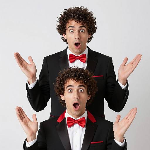 alber elbaz costume, photograph, young man, nerdy glasses, brown hair, short hair, light skin, golden tuxedo, yellow fur collar, red bow tie, white shirt, yellow pocket square, standing, hands on hips, confident expression, street background, daytime, soft lighting, urban setting, slight blur in background, stylish, formal attire, retro fashion, tuxedo jacket, sharp suit, symmetrical composition