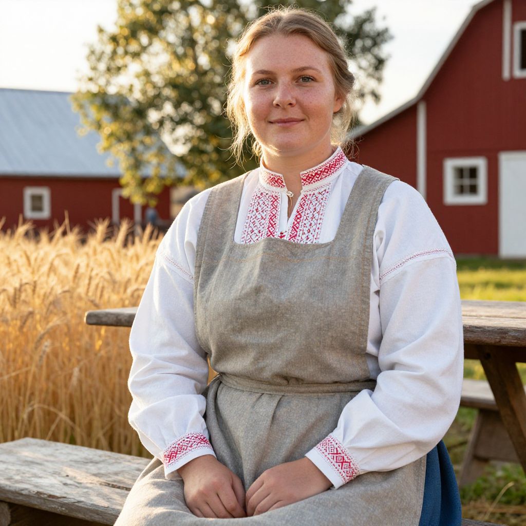 Photograph of a fair-skinned, blonde woman with light brown eyes, wearing a traditional white blouse with red embroidered patterns on the collar and cuffs, and a gray pinafore dress. She sits on a rustic wooden bench in a sunny rural setting, with golden grass and a red barn with white trim in the background. Her hair is tied back, and she smiles gently at the camera. The sunlight casts a warm glow, highlighting the textures of her clothing and the natural surroundings.