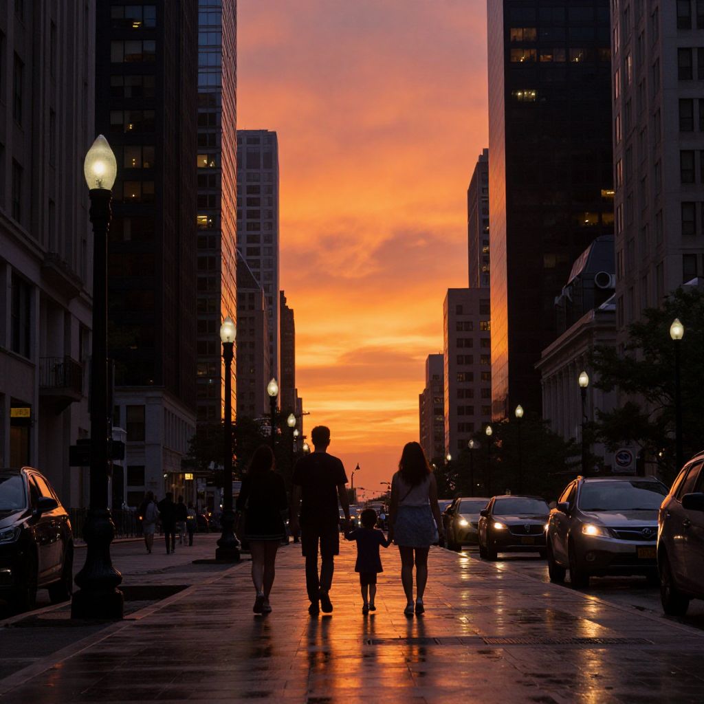 Sunset bathes a bustling urban street in vibrant hues of orange and red, casting long shadows as three silhouetted figures—a man, a woman, and a child—walk hand-in-hand toward the horizon, framed by towering skyscrapers and lined with glowing street lamps reflecting off wet pavement.