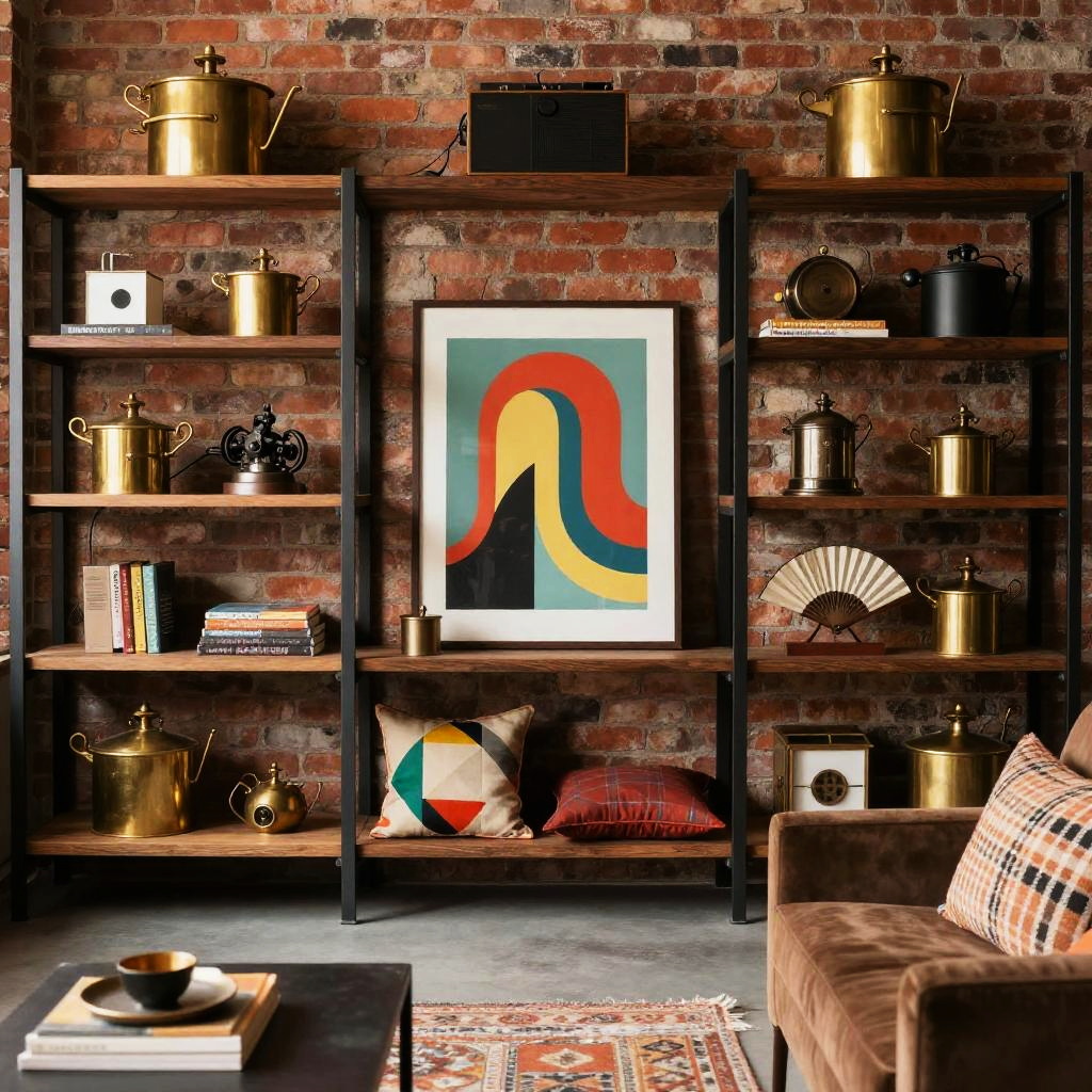 Industrial eclectic living room with metal and wood shelving units, exposed brick, brass fixtures, retro pop art, soft textiles in bold patterns, and vintage mechanical objects, creating a layered space that merges antiquity and modern style, photorealistic.