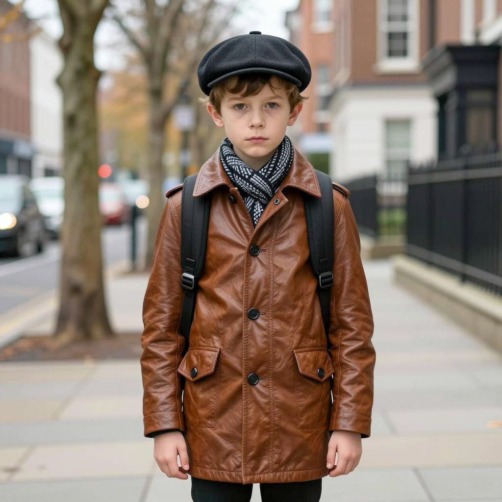 Young boy with fair skin and brown hair, wearing a black New York Yankees cap, black jacket, gray shirt, and blue jeans, holds a beige bag with "USA" in large letters. He stands in a leafy backyard with a wooden fence, car, and scattered debris in the background. His facial expression is neutral. He carries a red strap over his shoulder.