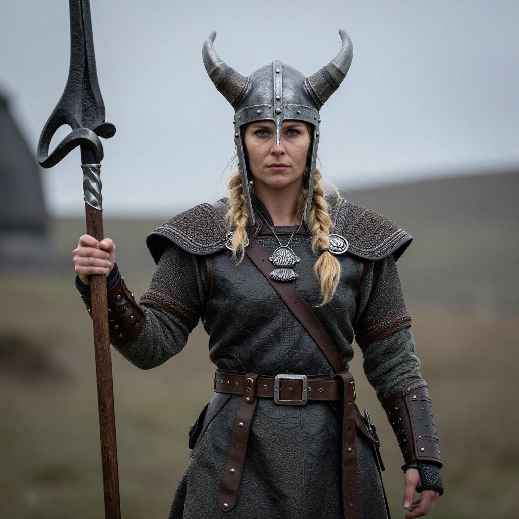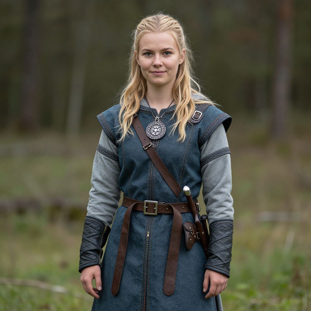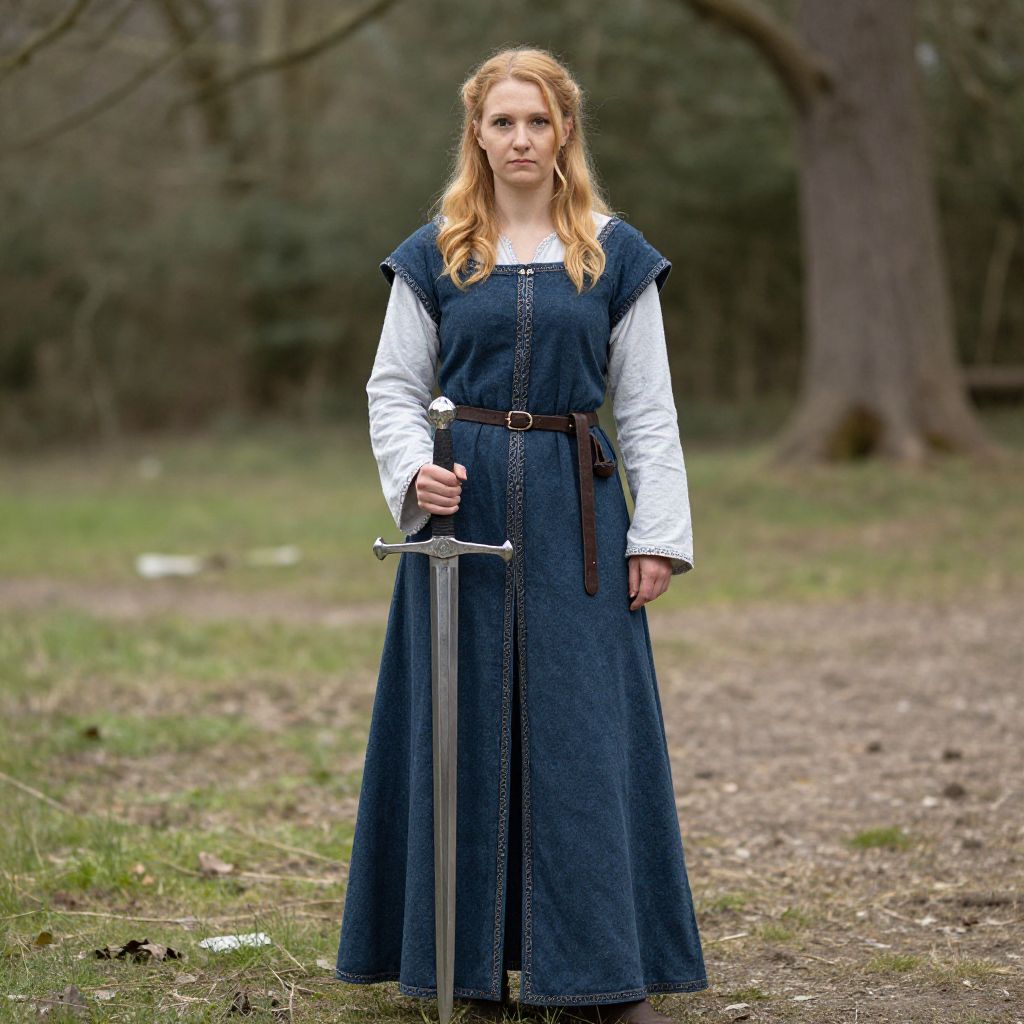 Photograph of a blonde woman in medieval attire, red cloak, white shirt, brown leather gloves, boots, holding a sword, standing under a large
