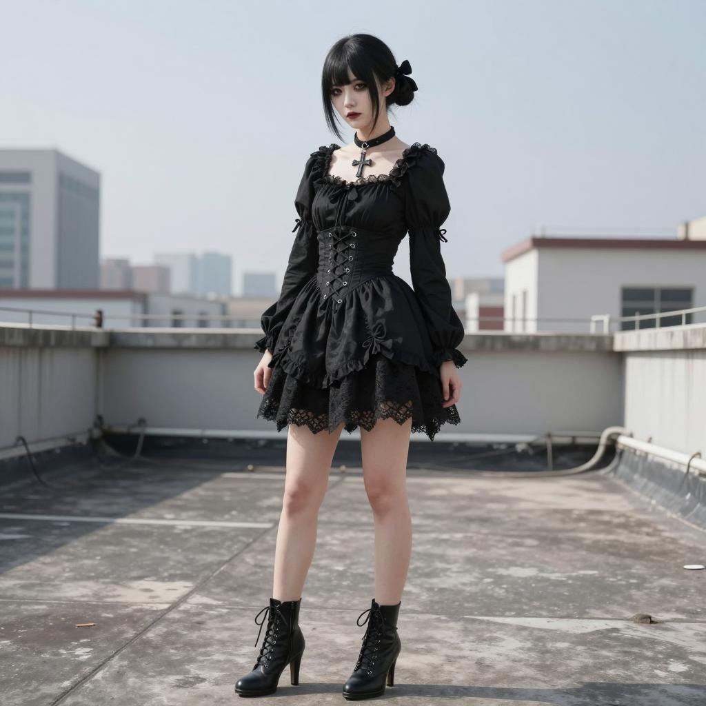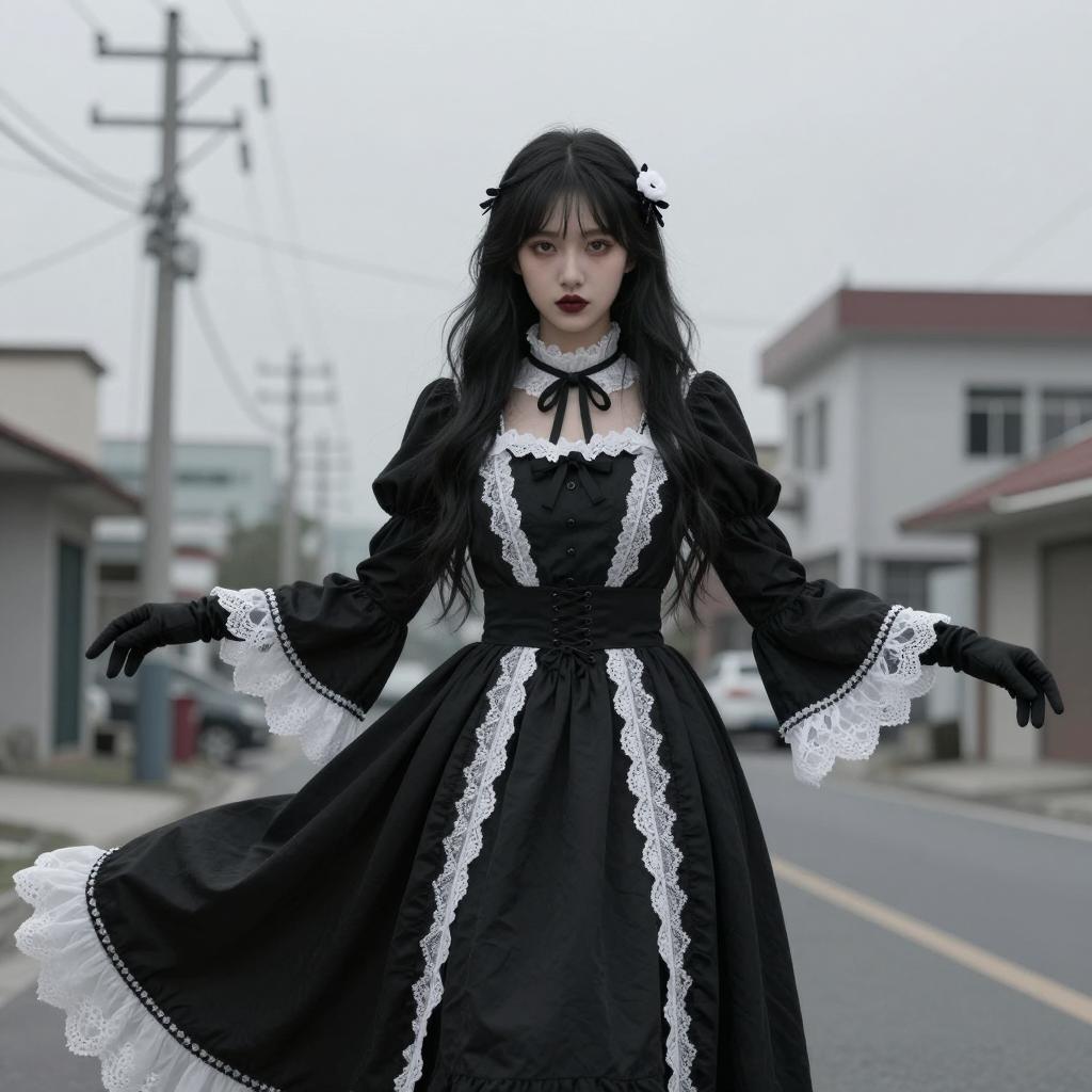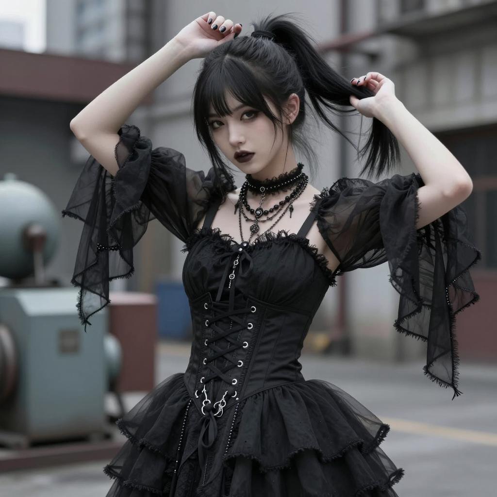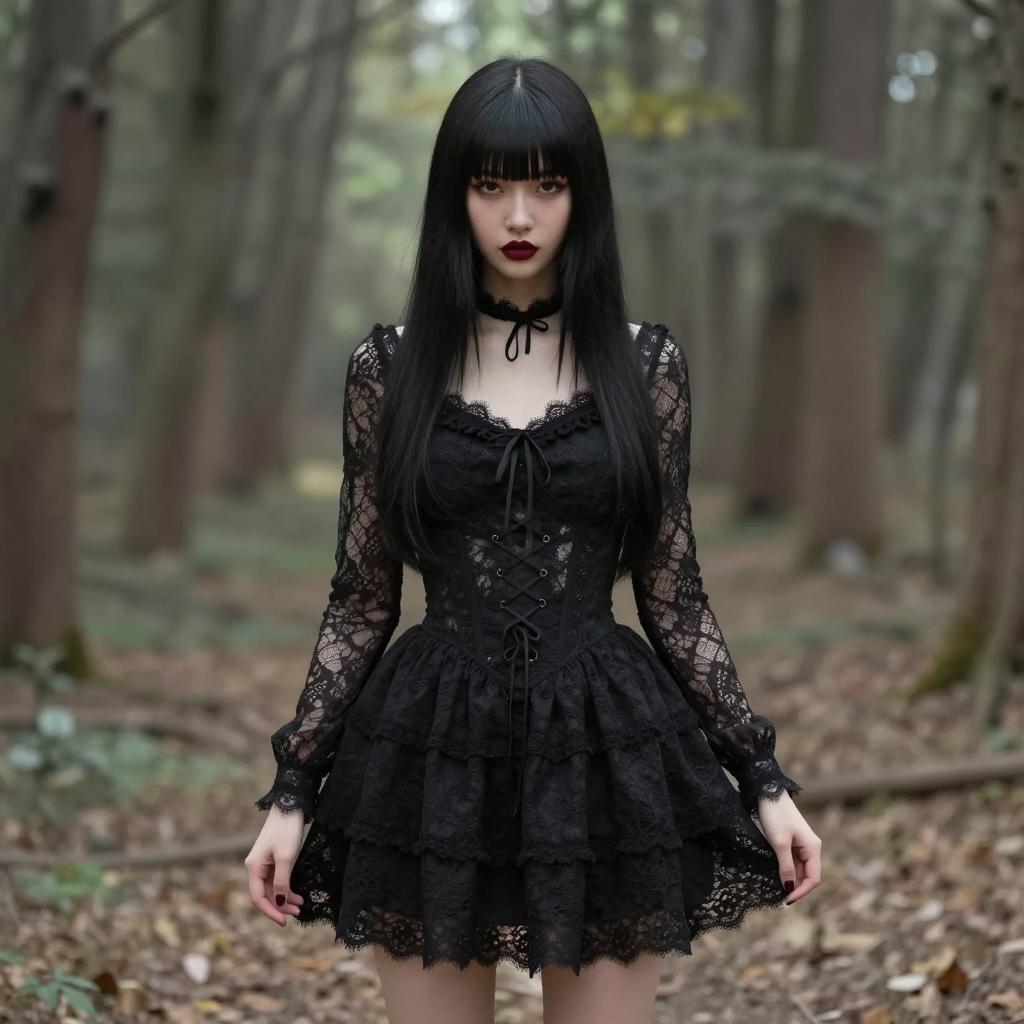 Photograph of a young woman with long black hair and blunt bangs. She wears a black lace dress with long sleeves, lace-up corset-style bodice, and lace trim. Her dark red lipstick contrasts with pale skin. She stands in a forest with blurred trees in the background. She has a neutral expression. Her arms are slightly bent at the elbows, and she stands with her legs apart.