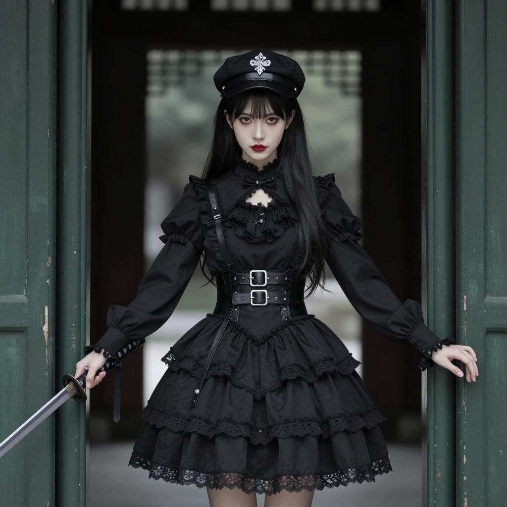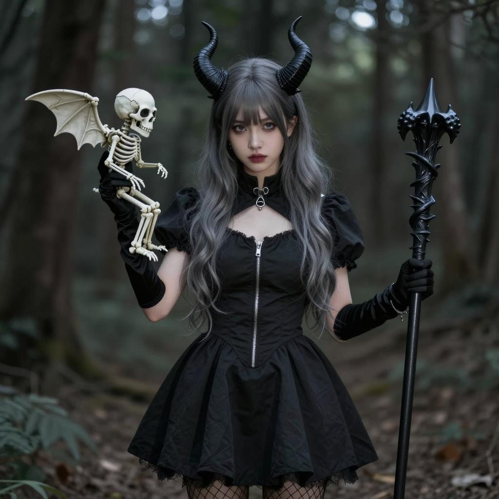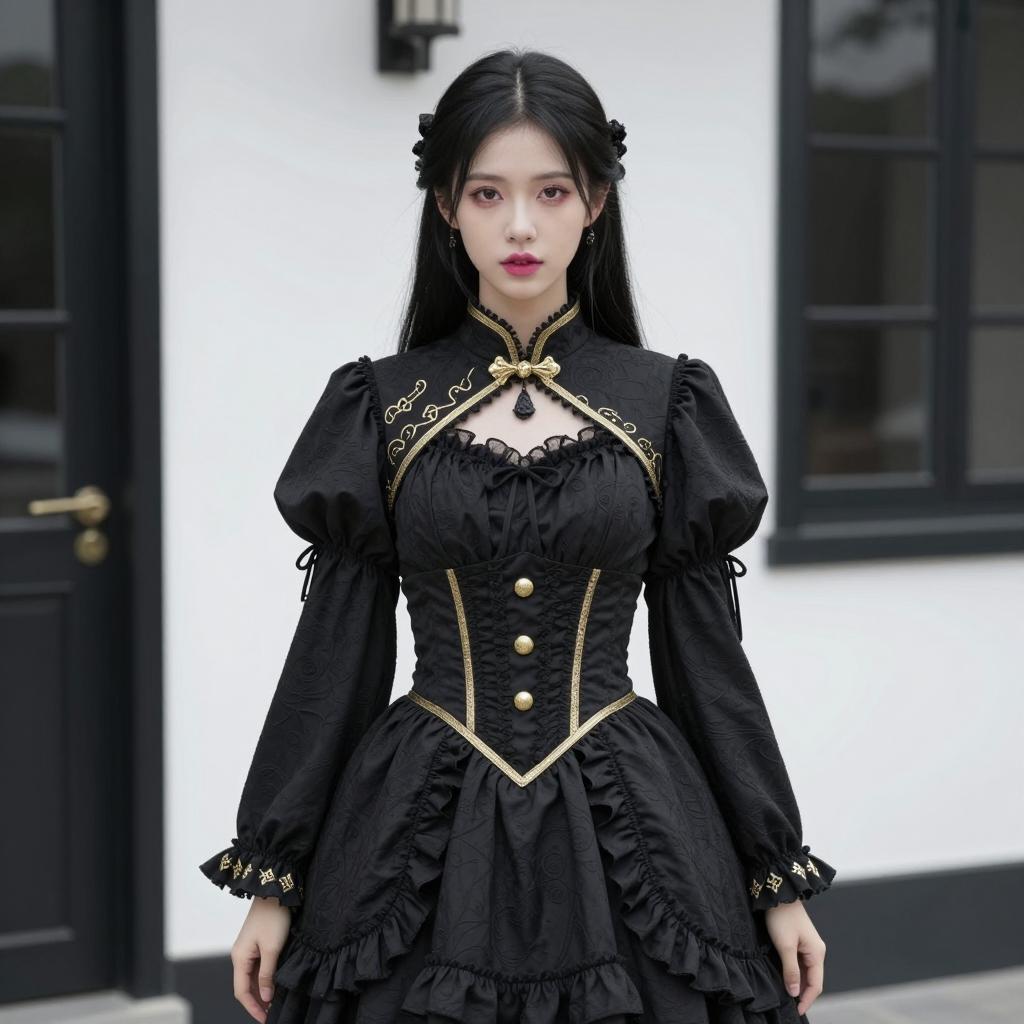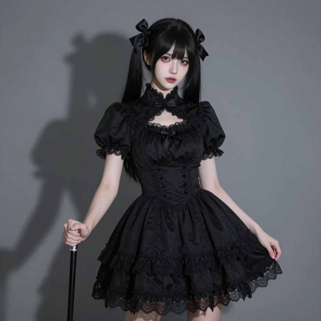 Photograph of a young woman with long black hair and blunt bangs. She wears a black lace dress with long sleeves, lace-up corset-style bodice, and lace trim. Her dark red lipstick contrasts with pale skin. She stands in a forest with blurred trees in the background. She has a neutral expression. Her arms are slightly bent at the elbows, and she stands with her legs apart.