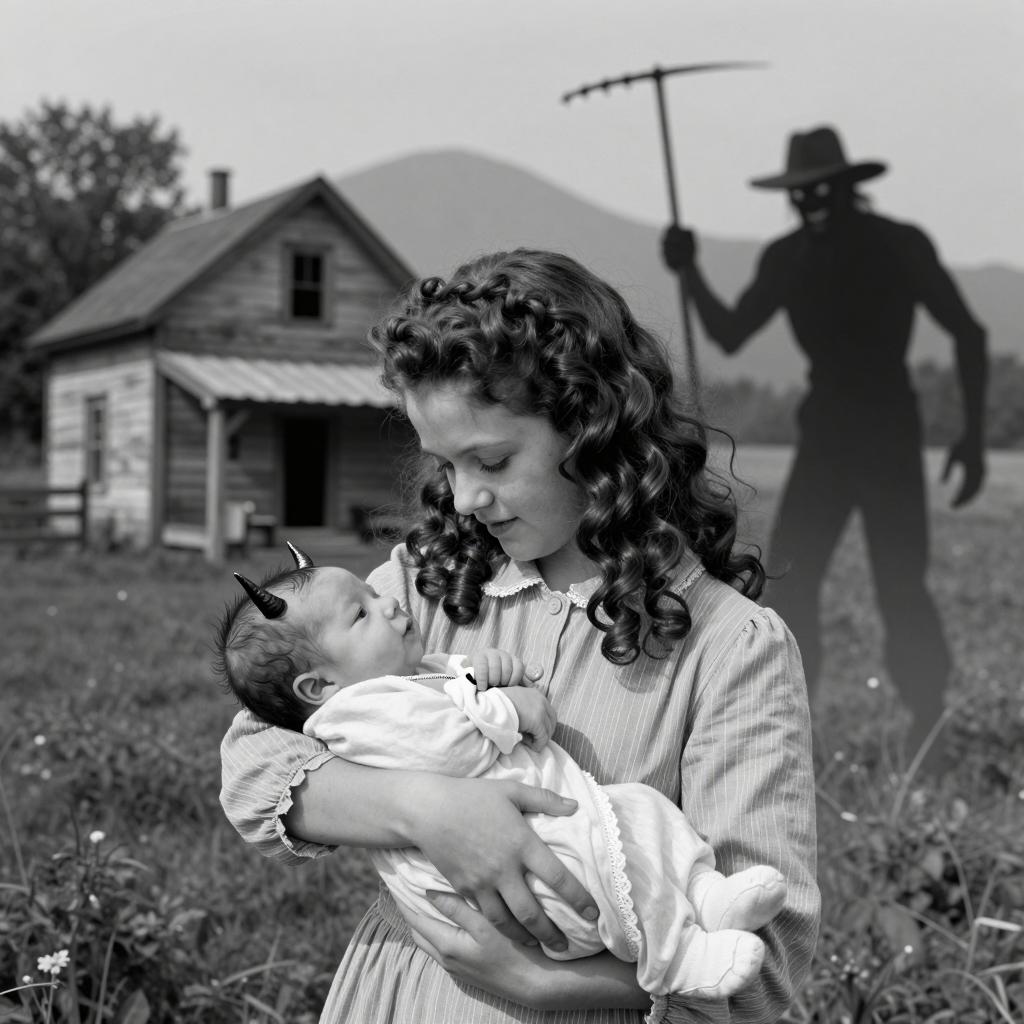 Ink Drying Time portrait of a 1940s farm girl with long curly silky black hair wearing a dress and holding her swaddled newborn baby that has a devil tail and horn nubs, an old farm house is in the background behind the farm girl and a male farmer shadow figure warped and surreal evil figure holding a pitchfork looking malicious by the house, tree covered mountains on the horizon,