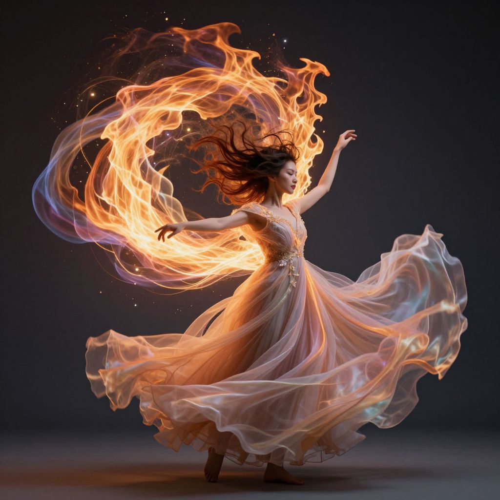 A woman in a flowing gown spins gracefully, her hair transforming into a cascade of vibrant, swirling flames and ethereal ribbons of light, defying the boundaries between matter and energy.