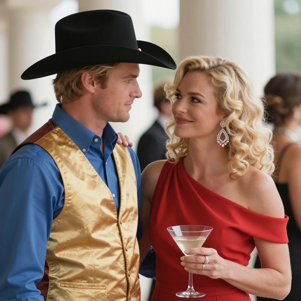 A man with a bald head and light brown hair, wearing a white shirt with green suspenders, kissing the neck of a blonde woman with wavy hair. The woman wears a red and white strapless top, her arms bound with rope to a tree. The background shows green trees. The man's eyes are closed, the woman's eyes are half-open, and she has a slightly open mouth. The man's head is tilted to the side, and the woman's head is turned slightly to the right. The man's left hand is on the woman's right arm. The image captures a moment of intimate contact between the two people.
