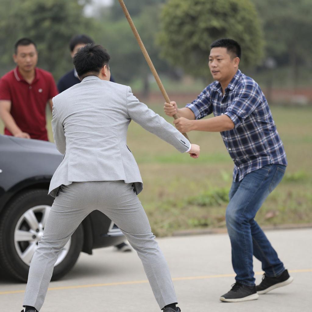 Photograph of a high-speed car chase on a mountain road. A man in a white shirt and black pants leaps from a blue truck, aiming to tackle a black car. The truck's rear end and the car's front are close, with yellow road lines and green hills in the background.