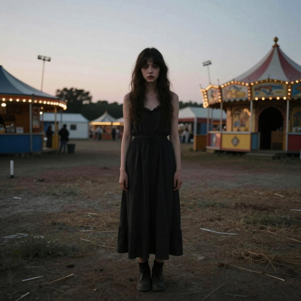 In a deserted carnival at twilight, she stands alone, a melancholic ghost drifting through a harsh reality. Her stunning yet sepulchral grace is a testament to a heart hardened by suffering, inspired by the works of Mark Brooks and Gerda Wegener.
