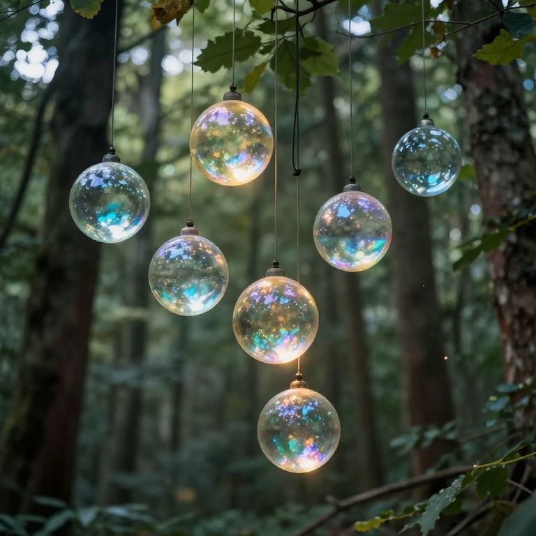 Suspended glass orbs dangle like celestial lanterns in a forest, their iridescent glow defying gravity and casting an otherworldly shimmer across the tranquil woodland.