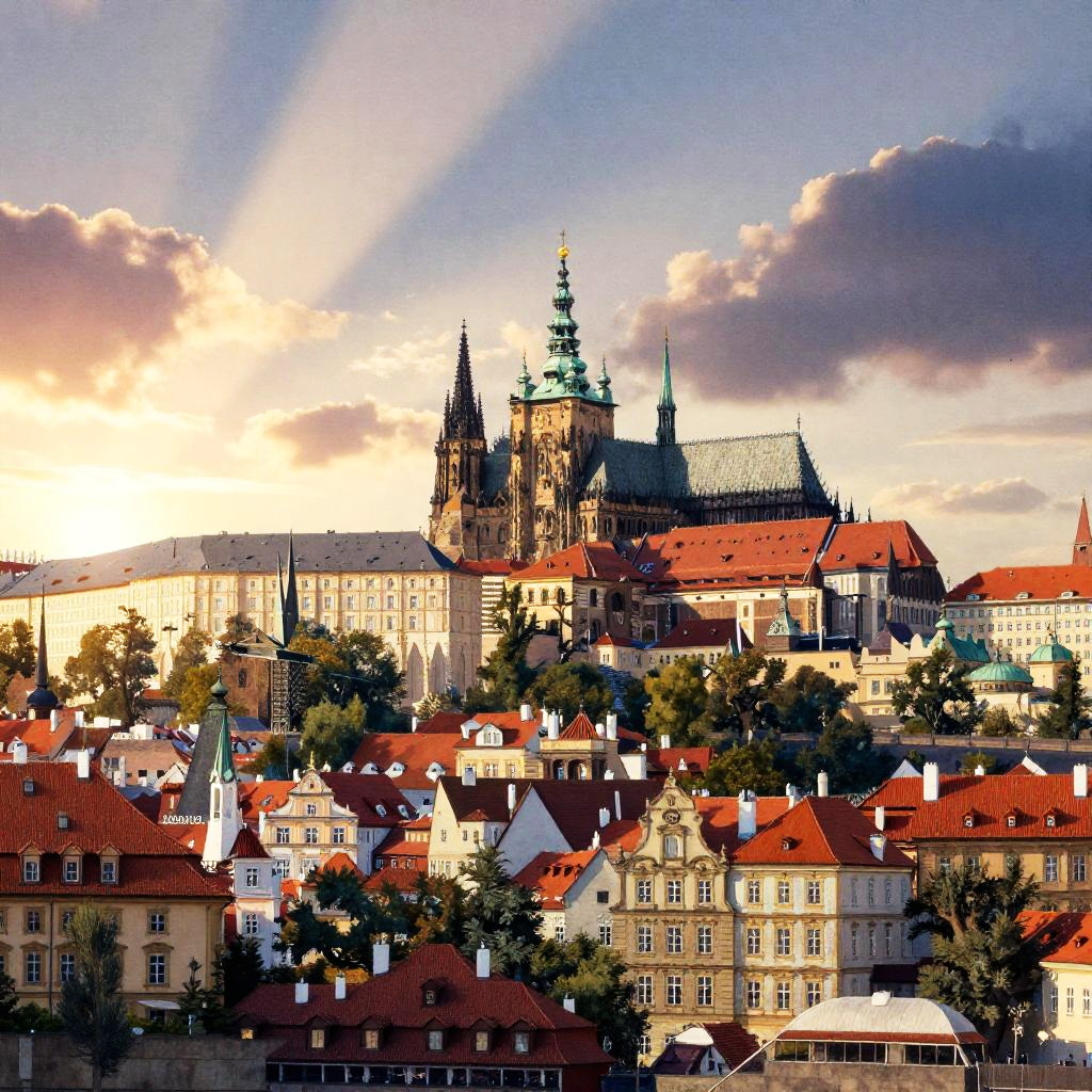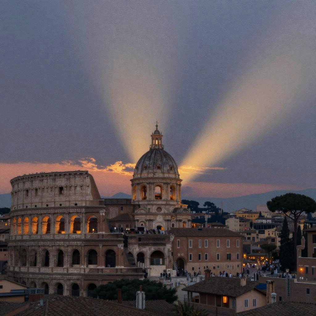 Skyline of Rome at dusk, pastel drawing, ambient lighting, god rays