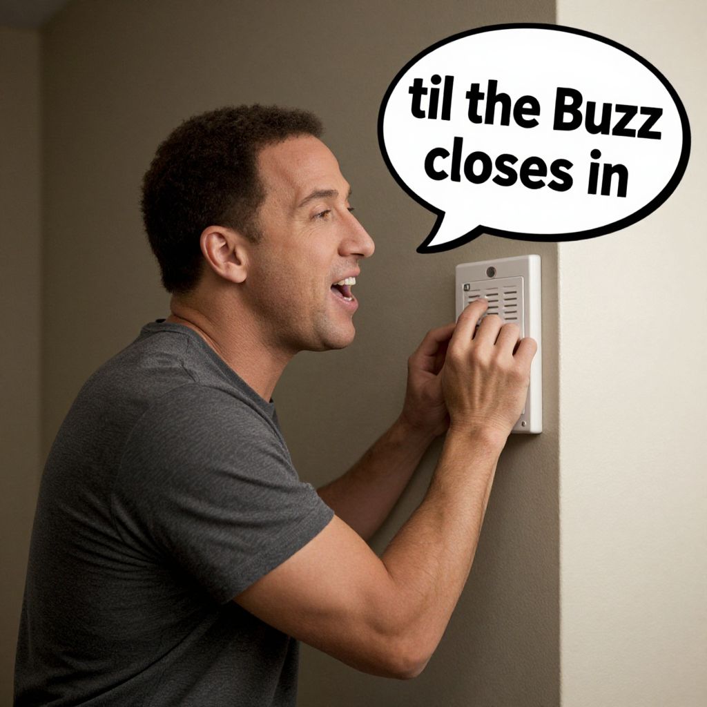 Photograph of a light-skinned, short-haired African-American man with a medium build, wearing a dark gray t-shirt, standing in a room against a beige wall. He is smiling while pressing a white buzzer with his right hand. Above the buzzer, a speech bubble with bold black text reads, "til the buzzer closes in." The lighting is bright, highlighting his face and the buzzer. The background is simple, with no additional objects or decorations visible. The man's expression is playful and slightly anxious, suggesting a humorous or tense situation.