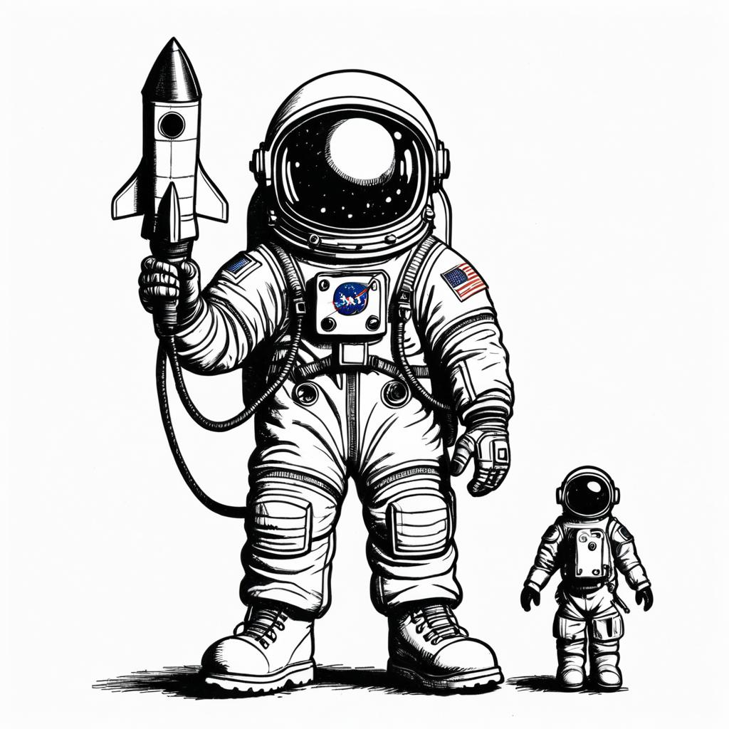 An extreme caricature of a curious astronaut, hand drawn in black on a white background. The character has exaggerated proportions, with an overly large helmet and disproportionately small boots and is holding a miniature rocket.