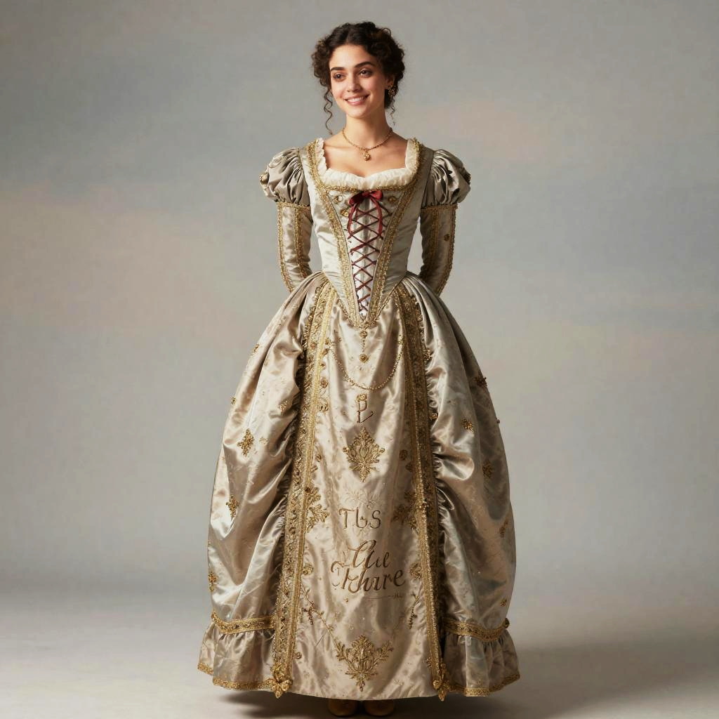 A woman dressed in an elegant golden 18th-century style gown poses against a muted brown background, embodying the essence of classical portraiture with a soft, warm lighting that highlights the intricate textures and ruffles of the costume. Her voluminous curly blonde hair and subtle, confident expression enhance the vintage, realistic style of the image.